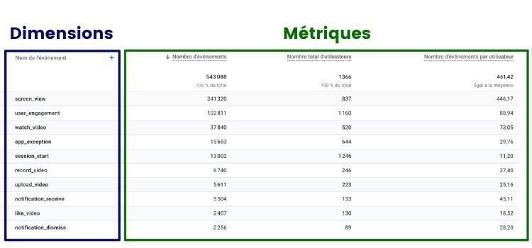 La maîtrise des notions de métriques et de dimensions est importante lorsque l’on travaille avec de la data. Les métriques, qui sont numériques et peuvent s’additionner (par exemple : nombre d’évènements), diffèrent des dimensions qui représentent une caractéristique spécifique (comme le type ou le nom d’évènement).